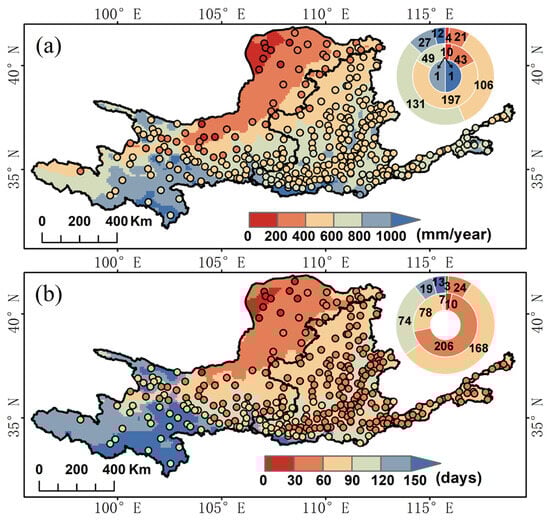 The average annual precipitation and annual precipitation days in the Yellow River Basin based on ERA5-Land and station observations have the same variation trend. They all show an increasing trend from the northwest to the south. However, the average annual precipitation and annual precipitation days in the upper basin have great spatial differences. The middle basin and lower basin are relatively small. According to statistics, ERA5-Land significantly overestimated stations with annual precipitation greater than 600 mm/year (Figure 3a), and stations with annual precipitation days greater than 60 days (Figure 3b). Only forty-nine station observations monitor annual precipitation between 600 mm and 800 mm per year, while ERA5-Land captures one hundred and thirty-one stations within this range. The number of ERA5-Land monitoring stations with annual precipitation greater than 800 mm/year is thirty-seven more than that of stations based on observations. The number of stations with precipitation days between 60 days and 120 days based on station observations is one hundred and fifty-seven fewer than that of stations with precipitation days captured by ERA5-Land. ERA5-Land has identified thirty-two stations with more than 120 days of precipitation. Meanwhile, the number of precipitation days of three hundred and one stations based on station observations is less than 120 days.
