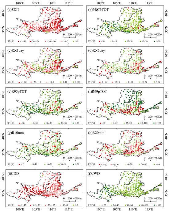 The spatial pattern of the RB of different extreme precipitation indices including (a) SDII, (b) PRCPTOT, (c) RX1day, (d) RX5day, (e) R95pTOT, (f) R99pTOT, (g) R10mm, (h) R20mm, (i) CDD, and (j) CWD between ERA5-Land and station observations.