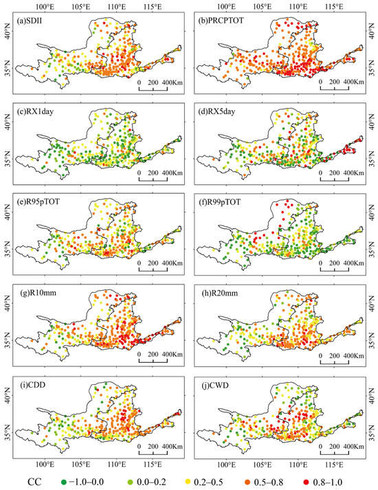 The spatial pattern of CCs for different extreme precipitation indices including (a) SDII, (b) PRCPTOT, (c) RX1day, (d) RX5day, (e) R95pTOT, (f) R99pTOT, (g) R10mm, (h) R20mm, (i) CDD, and (j) CWD between ERA5-Land and station observations.