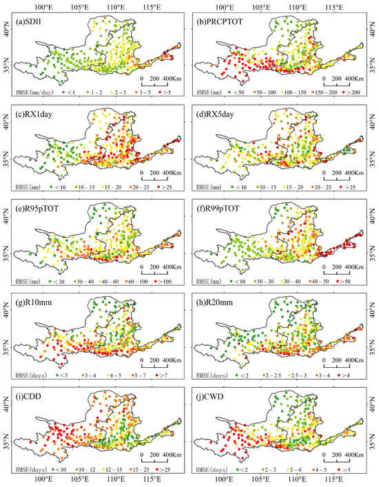 The spatial pattern of RMSEs for different extreme precipitation indices between ERA5-Land and station observations. The RMSE units are mm/day for (a) SDII; mm for (b–f) PRCPTOT, RX1day, RX5day, R95pTOT, and R99pTOT; and days for (g–j) R10mm, R20mm, CDD, and CWD.