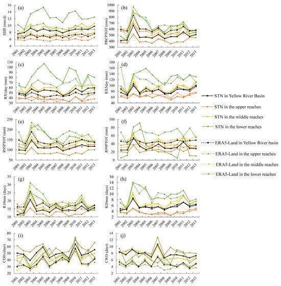 The temporal evolution of various extreme precipitation indices based on both ERA5-Land and station observations including (a) SDII, (b) PRCPTOT, (c) RX1day, (d) RX5day, (e) R95PTOT, (f) R99PTOT, (g) R10mm, (h) R20mm, (i) CDD, and (j) CWD. STN indicates station observations. The black lines represent the indices for the entire Yellow River Basin; the orange lines represent those for the upper basin; the yellow lines represent those for the middle basin; the green lines represent those for the lower basin.