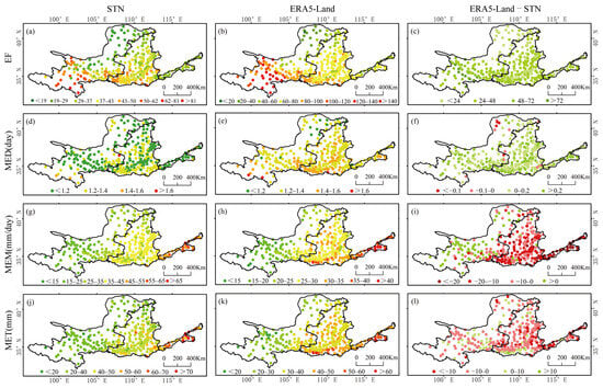 Spatial pattern of event characteristics for (a,d,g,j) station observations and (b,e,h,k) ERA5-Land, as well as (c,f,i,l) the difference between ERA5-Land and station observations. STN indicates station observations.