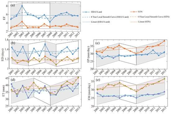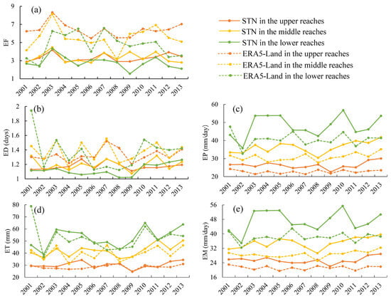 Specifically, from 2001 to 2013, ERA5-Land significantly overestimated the EF (Figure 10a) and ED (Figure 10b) of extreme precipitation events in the Yellow River Basin. The most severe overestimation EF occurred in 2003, where the overestimate reached up to four times (Figure 10a). Conversely, ERA5-Land significantly underestimated the EP (Figure 10c) and ET (Figure 10d), which aligns with the conclusion from Figure 5 that ERA5-Land underestimates R20mm and is consistent with the spatial distribution observed in Figure 9, with the most significant underestimation of EP occurring in 2005 (Figure 10c). However, ERA5-Land’s ability to capture EM was relatively accurate, with smaller margins of overestimation and underestimation (Figure 10e).