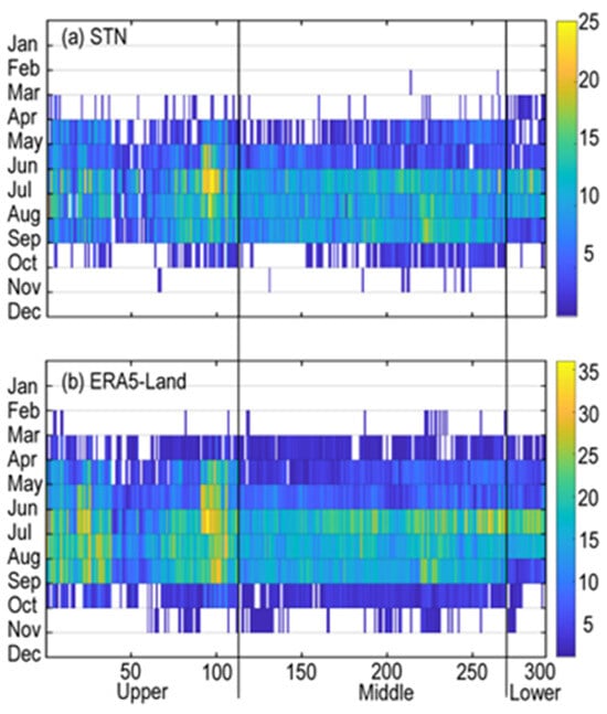 ERA5-Land’s detection of extreme precipitation events frequency differs by station and month (Figure 11). ERA5-Land’s annual cumulative extreme precipitation frequency from 2001 to 2013 exceeds station observations, mirroring the trend in Figure 10a. Data from ERA5-Land and station observations indicate that extreme precipitation typically falls from April to August, with a hiatus from November to February. The Yellow River Basin’s extreme precipitation pattern over thirteen years is similar, with events in the upper basin from April to August, in the middle basin from June to August, and in the lower basin concentrated in July and August.