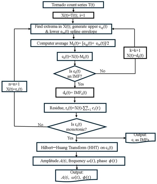 Like many other real-world data signals, tornado count time series, which are nonlinear and nonstationary, are not well decomposed by traditional Fourier transform (FT) or wavelet transform methods. Strictly speaking, FT is only applicable to linear stationary processes, although short-time FT could partly resolve the nonstationarity issue Similarly, the wavelet transform is unable to account for nonlinearity. In addition, both FT and wavelet methods assume a priori base functions. Huang and his collaborators first proposed a novel empirical mode decomposition (EMD) that applies to both nonlinear and nonstationary processes without a priori assumptions [22]. EMD is an adaptive and fully data-driven method without a priori assumptions about data linearity or stationarity. Since the intrinsic model functions are self-extracted from data intrinsically (rather than using harmonics), they represent underlying physics more directly than other methods that use sine/cosine waves as base functions.