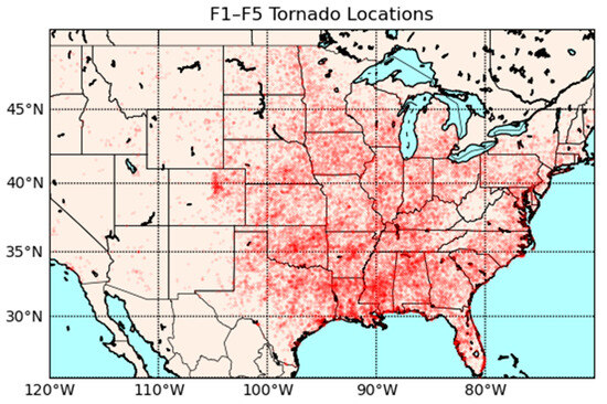 The tornado dataset used in this study was produced by the Storm Prediction Center (SPC) of the National Oceanic and Atmospheric Administration (NOAA). This data file encompasses detailed records of tornado events that occurred in the U.S. from 1950 to 2022 [25]. Each tornado entry in the file represents a unique tornado event, providing comprehensive data that include the date and time of occurrence, geographical coordinates (latitude and longitude), and the Fujita or Enhanced Fujita (EF) scale rating that measures the tornado’s intensity. A total of 68,706 tornadoes were reported in the data file located at https://www.spc.noaa.gov/gis/svrgis/ (accessed on 24 June 2023). Additionally, the file includes information on the tornado’s path length and width, which are critical for understanding the scope and impact of each event.