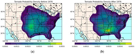 Tornado (F1–F5) probability density distribution computed from the Gaussian kernel density (GKD) function as implemented in SciPy (https://het.as.utexas.edu/HET/Software/Scipy/generated/scipy.stats.gaussian_kde.html (accessed on 8 October 2024). The units are probability per km2. (a): before 1976; (b): after 1976. The three regional centers of 5° × 5° lat./lon. are delineated as western TX–OK Tornado Alley (100–95° W, 33–38° N), Dixie Alley (93–88° W, 30–35° N), and northern center (92–87° W, 38–43° N). The two southern centers are the focus of this study while the northern center is mainly for completeness. The division between the western and eastern U.S. is at 95° W.