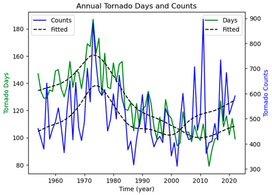 Annual F1–F5 tornado days (left y-axis, green curve) and tornado counts (right y-axis, blue curve) over the U.S. The smooth dashed curves are local fits using LOWESS (locally weighted scatterplot smoothing), as implemented in the Python package [37]. The smooth span is 0.4.