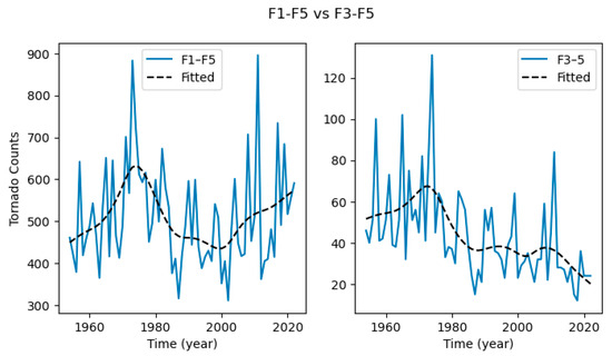 Most tornado fatalities are inflicted by severe tornadoes, with 67% inflicted by strong ones (F2 and above) and 2% by violent ones (F4 and above) [38]. In this study, F3–F5 (inclusive) tornadoes are called severe tornadoes, contrasting with all tornadoes (F1–F5). Typically, severe tornadoes live longer, are more visible, and follow longer paths; they are thus less likely to be missed in reporting. In comparison, weak tornadoes (F0–F1) are more likely to be underreported, especially during the early times [19]. As such, the number count of severe tornadoes should be more robust than that of weak ones.