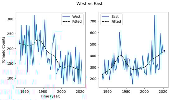 Severe (F3–F5) tornadoes increased until the 1970s, decreasing thereafter from over 60 annually to around 30 tornadoes per year (Figure 5). This decrease is significant given that severe tornadoes should be less affected by anthropogenic factors, such as detection improvements. For example, it is believed that the weak F0–F1 increase is partially due to detection technology, particularly the gradual installation of the WSR-88D in the early 1990s [39]. The temporal variation of tornado counts in the western and eastern U.S. shows almost opposite trends during the later portion of the study period (Figure 6).