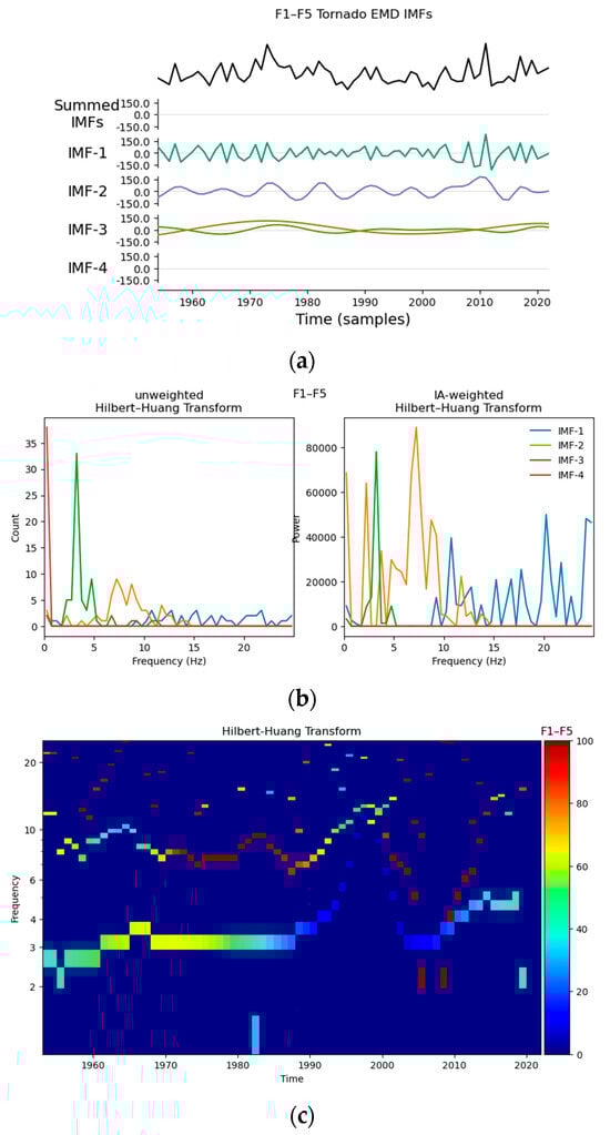 The empirical mode decomposition (EMD) analysis of all F1–F5 tornadoes over the U.S. during 1954–2022. (a): Intrinsic mode functions (IMFs), (b): The marginal spectrum of IMFs, (c): The time–frequency–amplitude color-mesh plot of the Hilbert–Huang transform [31]. The y-axis in (c) is frequency in cycles per 69 years. The color scheme for amplitude (c) and the y-axis in (b) are in relative scales. The x-axis in (b) is frequency in cycles during the 69-year period. Each line (i.e., IMF) in (a) has its own y-coordinate where the brown curve corresponding to the last IMF is shifted upward because of its large amplitude.