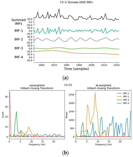 Unlike previous traditional tornado analyses, EMD is used here to analyze the temporal variation of tornadoes [11,12,20]. The summed IMFs synthesizing IMF-1 through IMF-4 recover the actual time series of tornado count over the whole U.S. (Figure 7a). The highest frequency, IMF-1, represents interannual variability. The amplitude of this mode varies, being active before the mid-1970s and after the mid-2000s, with quietness between. The strongest interannual variability occurred from the mid-2000s to the mid-2010s. IMF-2 and IMF-3 have shown irregular oscillations during the last 20–35 years. The last IMF-4 is called the nonlinear secular trend. In EMD, the last IMF is the remainder whose curve does not cross the zero line as other modes (IMFs) do. This long-term trend peaked around the mid-1970s, corresponding to the most prolific tornadoes during this period, when the secular trend was the largest (Figure 7a, IMF-4, brown curve). It also trended upward, starting in the mid-2000s.