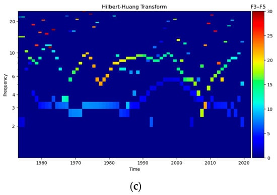Given the sharp difference in count trends between all F1–F5 and F3–F5 tornadoes (see Figure 5), the severe tornadoes show a picture of IMFs (Figure 8a) that is different from those in Figure 7 for all F1–F5 tornadoes. The number of tornadoes peaked in the late 1970s and decreased afterward, in contrast to the count for all F1–F5 tornadoes, which means that weak tornadoes contributed to the total increase seen in Figure 4. In other words, weak and strong tornadoes varied in opposite directions. The IMF-1 amplitude was larger prior to about 1975, which largely explains the summed count of F3–F5 tornadoes’ large fluctuations in the early decades. At the same time, IMF-2 and IMF-3 amplitudes and frequencies remained quite stationary. The secular trend also turned downward after peaking in the 1960s (Figure 8a). For F3–F5 tornadoes, the strongest signal is in IMF-2, with a frequency of 6–8 cycles during the 69 years, slightly lower than the IMF-2 for all tornadoes (Figure 8b). The strongest amplitude is in the mid-1970s to mid-1980s (Figure 8c).