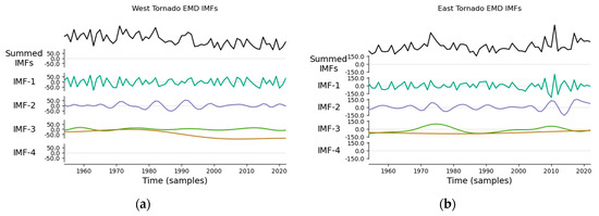 The tornado count decrease in the western U.S. was attributed, at least within the EMD domain, to the downturn of secular trend IMF-4 (Figure 9a). The downturn stabilized, and the oscillation of IMF-2 damped, starting around 2000, when both the AMO and PDO shifted phases, the former toward positive and the latter toward negative phases [49].