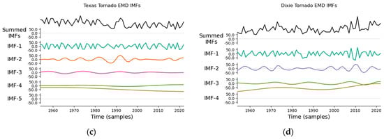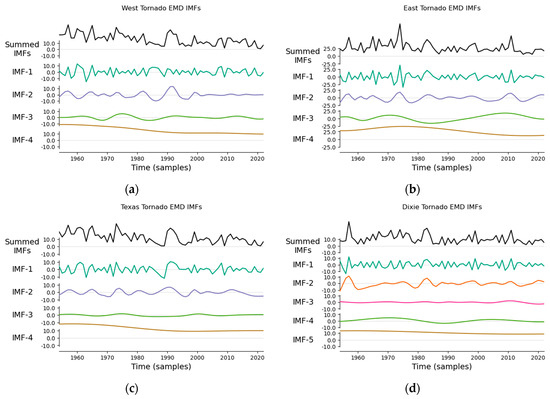 The IMFs of EDM for F1–F5 tornadoes from 1954–2022 over different subregions, as delineated in Figure 3. (a): Western U.S; (b): Eastern U.S.; (c): TX–OK Tornado Alley; and (d): Dixie Alley. Each line (i.e., IMF) has its own y-coordinate where the brown curve corresponding to the last IMF is shifted upward because of its large amplitude.