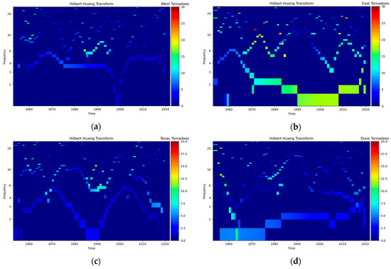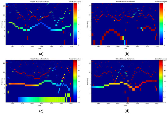 Figure 11 and Figure 12 show the IMFs and their HHTs, respectively, of F3–F5 tornadoes. Contrasting with F1–F5 tornadoes of varying frequency, F3–F5 tornadoes experienced a rapid decrease over the western U.S. before the 1990s (Figure 11a). Over the eastern U.S., strong tornadoes peaked in the early 1970s, when both IMF3 and IMF4 reached peaks (Figure 11b). Starting around 1980, these two IMFs ran in separate phases, resulting in an almost steady frequency. The TX–OK and Dixie Alleys behave similarly to their counterparts in the western and eastern U.S., respectively (Figure 11c,d).