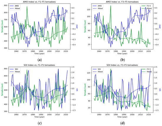 The U.S. severe (F3–F5) tornado count correlates negatively with the AMO index better than all F1–F5 tornadoes throughout the whole period (Figure 13b). The SOI’s relations with U.S. tornado counts are generally weaker, but mostly positive (Figure 13c,d).