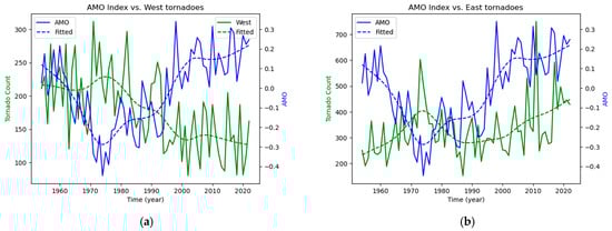 The tornado count decrease that started in the mid-1970’s over the western U.S., and to a lesser degree in the traditional TX–OK Tornado Alley, was likely related to the downturn of the nonlinear secular trend and damping of the low-frequency IMF-2 and IMF-3 . The decreasing trend stopped around 2000. Both the AMO and PDO shifted phases around the year 2000, with the former toward positive and the latter toward negative phases [49]. The western U.S. tornado count was also significantly correlated with the AMO index. Thus, the megadrought, cited as a reason for the tornado weakening, may be the outcome of an upward-trending AMO index that is positively associated with the southwestern U.S. temperature [14].
