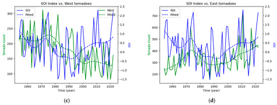 The AMO index correlates well with the western U.S. count, especially during the earlier portion of the period (Figure 14a). The same is roughly true for the eastern U.S. (Figure 14b). The SOI has a largely positive correlation with U.S. tornadoes. The long-term correlation is lower than the AMO because the SOI signal is the interannual oscillation (Figure 14c,d).