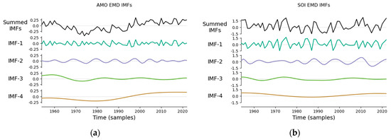 The IMFs of empirical mode decomposition (EMD) of the AMO index (a) and SOI (b).