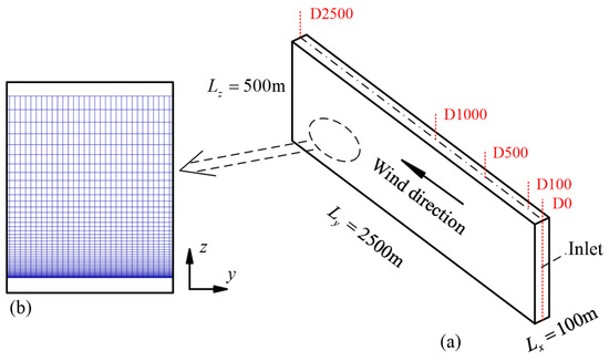 Modeling equilibrium PBL wind profiles is one of the preconditions for wind engineering applications. The streamwise gradients for wind profiles should be zero in numerical domains, where the momentum transport dominates the flow motions. These numerical properties validate CFD code performance by specifying the suitable boundary conditions, rough wall treatments, and turbulence closures [16,17,18]. Figure 1 presents the domain shape and its details in the surface grid. The dimension of CFD domains in direction is , which mainly develops the streamwise turbulent flows within the PBL (Figure 1a). As presented in Figure 1b, the structured hexahedral grid is refined in the bottom regions. The first grid thickness is 0.0342 m stretched with a ratio of 1.17 in the vertical direction. The horizontal grid is equidistantly spaced with 0.002 m. These configurations are selected under the discussion of grid sensitivity [19]. This mesh configuration has a finer grid resolution, which was used to investigate the PBL wind in other studies [15,20] and was chosen to correspond to the level of refinement for flow approaching an object in the numerical domain. Five positions of wind profiles D0~D2500 are extracted along the wind direction, where the Arabic numerals represent the straight-line distance from the inlet.
