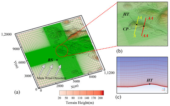 (a,b) are the structured grids on Askervein Hill case with central refinements close to measurements (Line A-A, AA-AA, RS and HT). Note that the positive X and Y axes represent the east and north directions, respectively. The green color gridlines represent the surface mesh grid. (c) Details of the XZ plane grid along with the hilltop HT. The red gridlines represent the spatial mesh grid, and blue background color is the working space during grid generation.