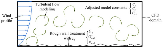 The wall function in the standard turbulence model is commonly used for the PBL flow with high Reynolds. These treatments are helpful in preventing a large number of grid cells near the rough ground surface, where the low Reynolds wind flow is found [15]. The standard wall functions, also referring to the sand-grain roughness or -type model, are integrated into the Fluent inner code and compiled as boundary field conditions of the nutRoughWall function in SimpleFoam. The wind velocity near the first cell of the wall is specified as: