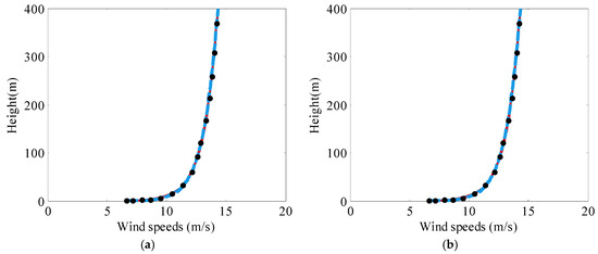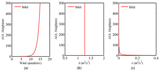Equation (15) shows the constant with respect to height. This format shows unphysical properties in the real atmospheric boundary layer, where the decay of with height is found. However, the combination of and expressions are solutions of the turbulent transport equations. Under neutral conditions, are given according to the curve-fitted observations in the sand sea [19]. Figure 4 shows the wind profiles specified in the inlet conditions. The top boundaries are specified as the Dirichlet boundary conditions, with the consistent wind velocities and turbulent scalars in the inlet conditions. The zero-gradient conditions are configured in the outlet, and the bottom terrain is treated as non-slip wall. The turbulent model constants are configured with the standard values .