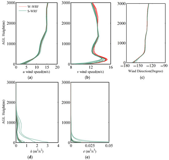 Figure 5 presents the time-averaged wind profiles computed in WRF. The main differences are found in higher values (), where hills or complex topographies are found near WRF surface grids. On higher regions of Figure 5d close to 500–2000 m AGL height, the produced in WRF exhibit undulating patterns. Such phenomena are possibly related to large-scale features captured on compressible, nonhydrostatic WRF Euler equations, e.g., gravity waves, but are not typically captured by engineering CFD codes.