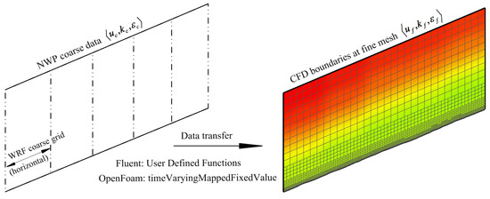 Wind profiles in Figure 5 are set as Dirichlet-type CFD boundary conditions. For the wind direction, the impact of meteorological forcing mechanisms, e.g., “Ekman spiral” related to Coriolis force, presents similar characteristics in two cases, causing a variation of 30 degrees along with 1 km height. These phenomena mean that the treatment of one site wind profile or unchanged wind direction used in idealized PBL flow simulation is unsuitable for meso- and micro-scale nested calculations. Figure 6 illustrates the offline data transfer procedure between the WRF coarse grid data and the CFD fine-grained mesh. Note that the horizontal grid nesting ratio between WRF and CFD varies from 101 to 102 during this coupling process. The inverse distance-weighted interpolation is firstly used to refine unresolved wind variables from WRF, and then is extracted by CFD solvers [31]. The Fluent code adopts the user-defined function to realize this lateral boundary specification, and the OpenFOAM solver utilizes the configured timeVaryingMappedFixedValue functions.
