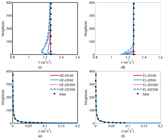 To quantify the predicted turbulent kinetic energy using different numerical configurations, the normalized mean square errors (NMSE) are used to calculate the decay of profiles at the outlet D2500 position. Table 4 summarizes this statistical index, indicating that the modified wall function is useful for improving the homogeneous turbulent surface layer. The NMSE in Figure 8b,e is decreased from 10-3 to 10-4 compared with the other profiles presented in Figure 7 and Figure 9. These improvements are validated in both Fluent and OpenFOAM solvers.