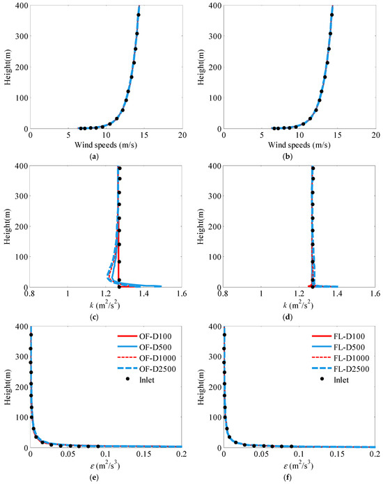 Comparison of inlet and outlet wind velocity profiles (a,d), turbulent kinetic profiles (b,e), and turbulent kinetic energy dissipation (c,f). The model constants and wall functions are configured with the standard treatments listed in Table 3. The different color lines represent the position extracted in Figure 1. (FL-Fluent code, OF-OpenFOAM code).