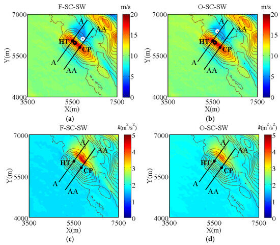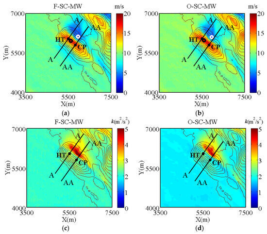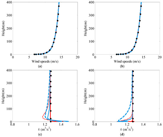 As for Figure 11, the horizontally distributed contours of wind velocities (a,b) and turbulent kinetic energy (c,d) are configured using the modified turbulence closures.