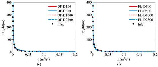 Comparison of inlet and outlet wind velocity profiles (a,b), turbulent kinetic profiles (c,d), and turbulent kinetic energy dissipation (e,f). The numerical cases are configured with the modified model constants and the standard wall functions, as listed in Table 3. The different color lines represent the position extracted in Figure 1.
