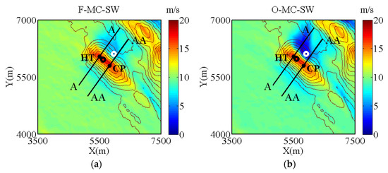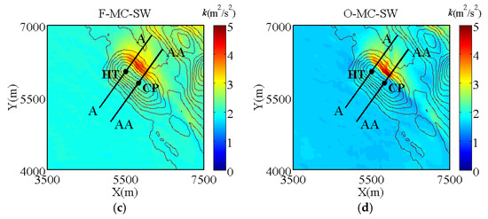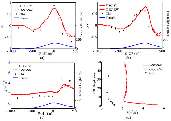 The improvements of and are found in Figure 12 by implementing the modified rough wall formulations, where and . These results confirm the necessity of specifying the aerodynamic roughness in the wall-adjacent cell to improve the numerical accuracy of . However, the validation of in Figure 10 and Figure 12 shows that the turbulent scalars are very sensitive to these recompiled CFD codes. The larger varied trend of vertical profiles is reproduced in the F-SC-MW case, accompanied with the enlarged results near the ground surface. These differences are obvious in Figure 13c,d. As compared with observations, the results are reasonable on the leeward side, whereas a significant amount of is found in the windward regions between −1000–0 m from HT. In the comparative studies using the flow solvers OpenFOAM and EllipSys3D, the shortcomings in predicting the correct levels in leeward regions are mentioned by Cavar et al. (2016) [33]. A substantial problem is found in the steady-state RANS turbulence closures used to predict the turbulence field, such as wind separation, which increases the turbulence levels accompanied by the intermittent flow patterns [34]. The transient RANS turbulence solver, accompanied by the high-order discretization schemes, is found to predict the turbulent field well.