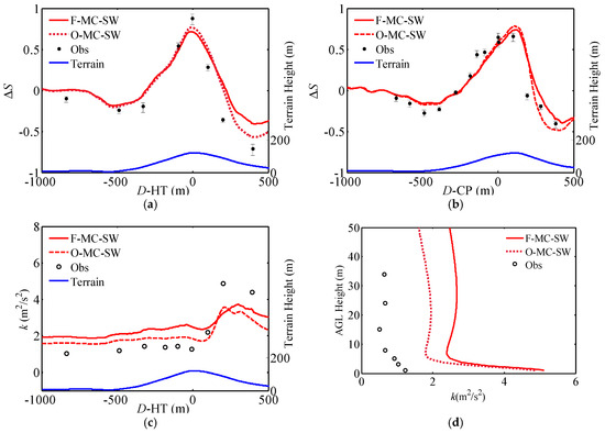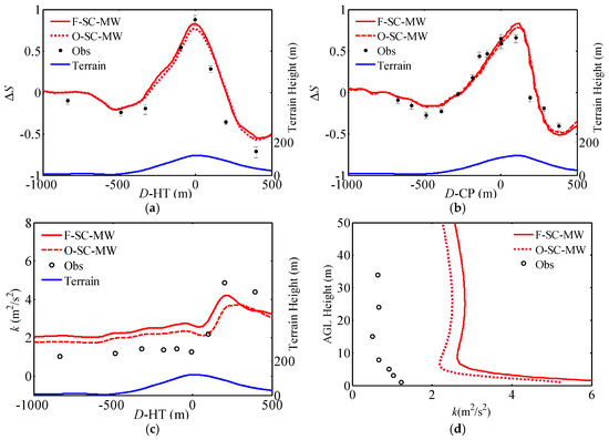 The modified wall functions (MW) are configured in the numerical cases. (a,b) are along line A-A and line AA-AA. (c) along lines A-A. The horizontally distributed profiles are 10 m AGL in height. (d) The vertical profile in the hilltop HT site.