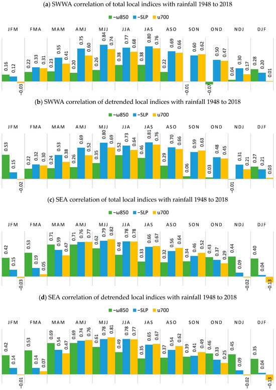 Correlation of 3-monthly average rainfall totals with local indices −ω850 (≡ −ω850), −SLP and u700 (≡ ) for period 1948 to 2018 and (a) SWWA total, (b) SWWA detrended, (c) SEA total and (d) SEA detrended quantities.
