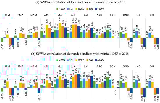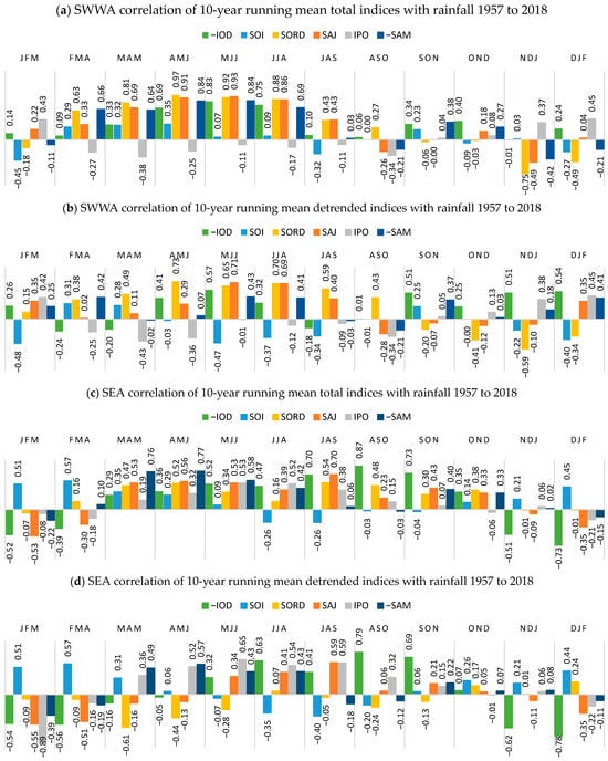 Figure 2 shows the average correlations for 1957 to 2018 of the five hemispheric and global circulation indices with SWWA and SEA rainfall for the 3-month periods from JFM to DJF. In broad terms, the correlations for the total data (Figure 2a for SWWA and Figure 2c for SEA) and the detrended correlations (Figure 2b for SWWA and Figure 2d for SEA) have similar seasonal variability. We note, however, that including the trends makes some difference.