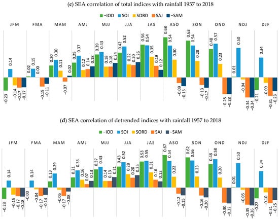 On decadal timescales, the importance of the large-scale indices for describing SEA rainfall variability is quite complex for the different 3-month periods as shown in Figure 4c,d. Overall, the highest correlations are with the IOD in ASO and SON for detrended and total data; the IOD also yields large negative correlations in NDJ, DJF and JFM. In JAS, the SAJ index dominates for both correlations, reflecting the July results of Ref. [], while in MAM and AMJ, the SAM index has the highest correlations, and in MJJ and JJA, the IPO plays an important role.
