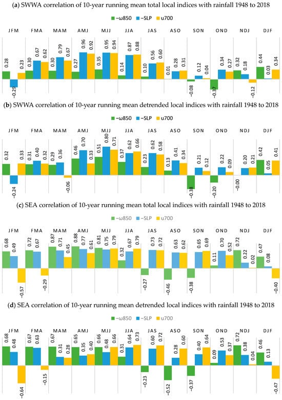 Correlation of 10-year running mean of 3-monthly rainfall totals with local indices −ω850 (≡ ), −SLP and u700 (≡ ) for period 1948 to 2018 and (a) SWWA total, (b) SWWA detrended, (c) SEA total and (d) SEA detrended quantities.