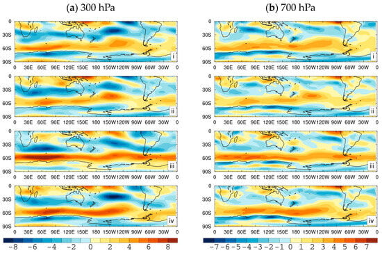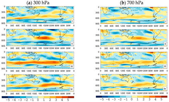 Southern Hemisphere zonal wind differences between 1997 to 2016 and 1949 to 1968 for (a) 300 hPa and (b) 700 hPa and for each season (i) JJA, (ii) SON, (iii) DJF and (iv) MAM.