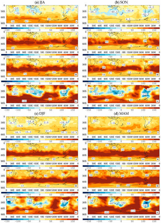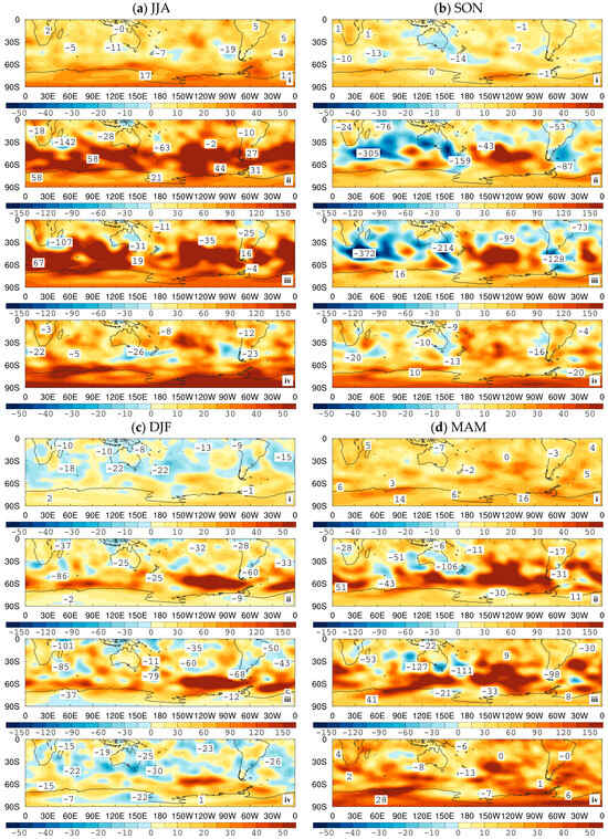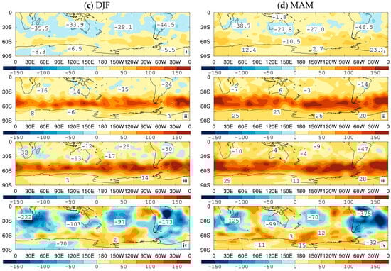 Southern Hemisphere differences between 1997 to 2016 and 1949 to 1968 standard deviation (scaled by 103) of high-pass filtered (period days) 850 hPa seasonal Southern Hemisphere streamfunction anomalies (km2s−1) for growth rate bins (i), (ii), (iii) and (iv), for (a) winter, (b) spring, (c) summer and (d) autumn.