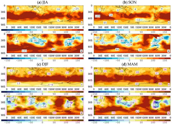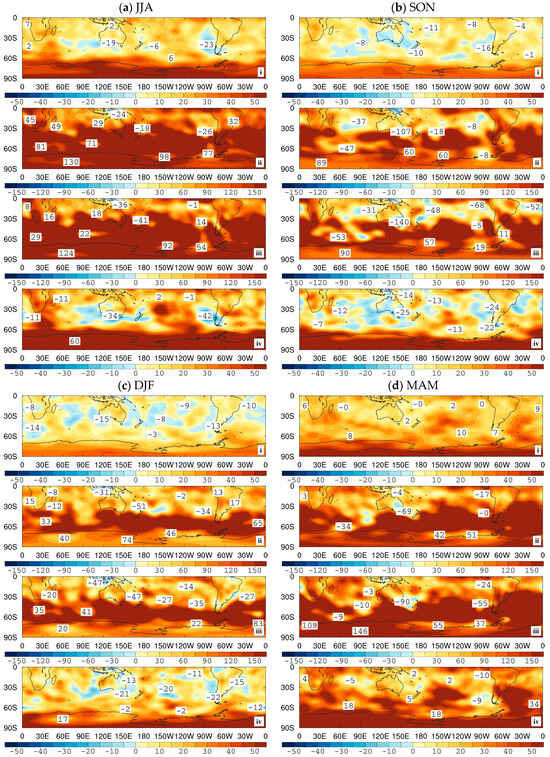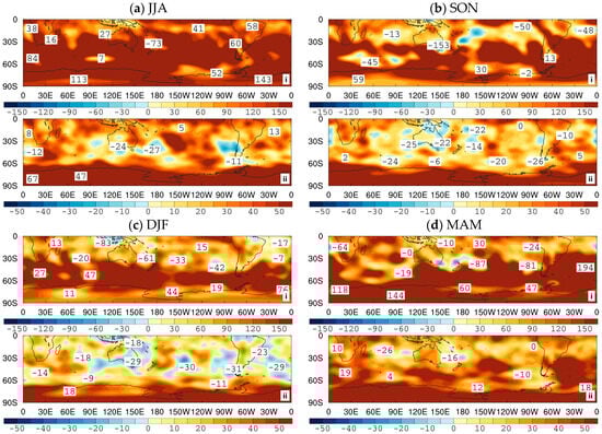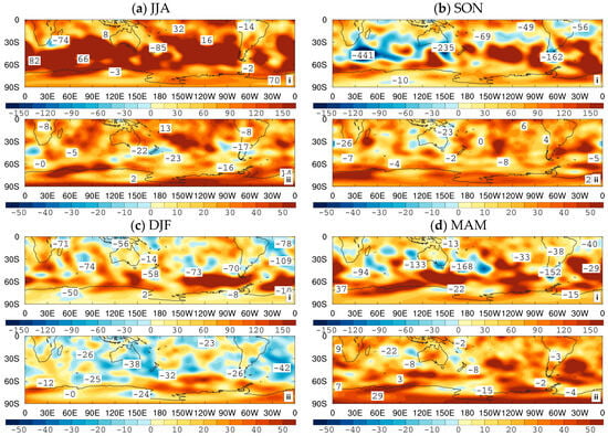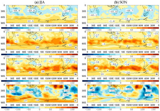 As noted in Ref. [] for July, the slower-propagating larger-scale weather systems with periods days in general grow and decay less rapidly than those in the high-pass band. This is reflected in the lower magnitudes in the STD differences of 850 hPa streamfunction fluctuation between 1949 to 1968 and 1997 to 2016 in the bins with and with in Figure 7 throughout the four seasons. In the bins with and , the STDs of weather system fluctuations broadly increased in the timespan 1997 to 2016 compared with 1949 to 1968 south of 30° S. The main exceptions are near and over SEA and the Tasman Sea, extending to New Zealand to some extent. The reductions are largest in the transition seasons of MAM, and particularly SON, where there are also reduced STDs over the Indian Ocean at 20° S and to the east of New Zealand.