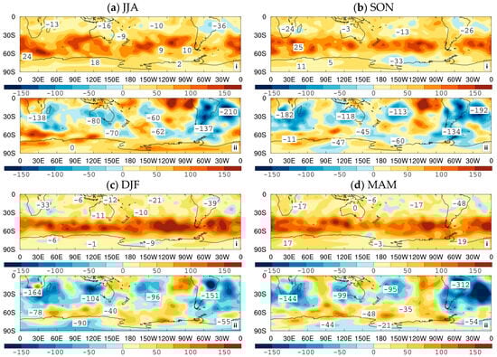 There are also regions of significant reductions in the zonal jets in Figure 5 both equatorward and poleward of the polar jet locations. At 300 hPa, in Figure 5a, we see that there is a decrease in jet strength between 0° and 120° E, particularly between 30° S and 40° S. Primarily over the South Pacific Ocean, the reductions occur at lower latitudes mainly between 20° S and 30° S. In the regions around South America and over the South Atlantic Ocean, the deficit in jet strength is centred near 40° S. There are also decreases in the 300 hPa zonal wind to the south of the polar jet stream. At 700 hPa, the zonal wind differences in general follow those in the upper troposphere with lower magnitudes although there are some notable differences. Over the Indian Ocean, the reductions are centred on 20° S in JJA and SON, and this is also the case over the eastern part of the South Pacific, particularly in SON, DJF and MAM.
