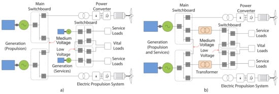 Figure 1. FEP system: (a) segregated FEP system, (b) integrated FEP system.A HPS system is the combination of a thermal-energy-based propulsion system with an electric propulsion system working either in parallel or in series, depending on the power ratings and operational profile of the ship. Figure 2 shows a typical parallel HPS configuration. A HPS can be operated in power take-in mode (PTI) such that the electric drive provides the required propulsion power, supporting the thermal-energy-based ICE, or in the power take-off mode (PTO), taking advantage of the remaining power that can be provided by the thermal-energy-based ICE to supply the main electric busbar, thus reducing and managing the required number of gensets. This configuration offers many benefits, including the efficient operation of the thermal-energy-based ICE at low ship speeds and an efficient power dispatch for the gensets, thus reducing emissions [75,76].
