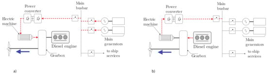 Figure 2. HPS: (a) PTO mode, (b) PTI mode.As it has the ability to work either in parallel or in series, and as it is in accordance with an efficient energy management system (EMS), this configuration results in the best performance of both drivers, at both low and heavy loads, keeping the whole system efficiently operating as well [77].The concept of electrification applies not only to ships but also to ports and shore docking facilities. The sharing of green energy from RESs such as wind, water, and solar from the land-based electrical grid of Chile has, in recent years, increased significantly. Therefore, combining this shift in shore-based green energy with ships capable of utilizing a shore connection will enable vessels to reduce their emissions dramatically. Figure 3 shows a general concept for a green port, consisting of a shore-to-ship and ship-to-shore electrical power supply, also known as bi-directional cold ironing, which integrates renewable energy sources as the main shore power supply.