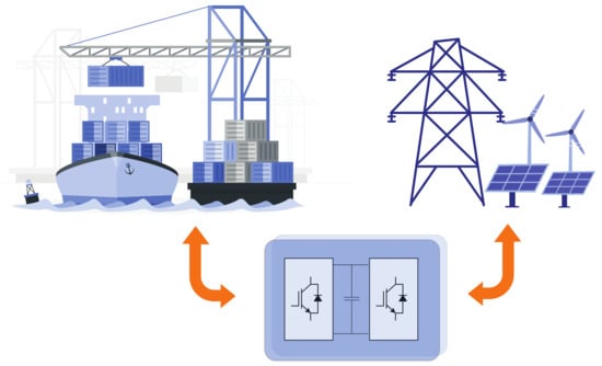 Figure 3. Green port concept using bi-directional power flow.This technological measure enables the reduction in emissions of ships at berth by using a bi-directional power flow control configuration and ensuring the ship’s gensets operate within their minimum emissions region.Green port integration is based on power converters with active front-end capabilities and a suitable power flow control strategy, which are required both to enable a shore-to-ship electric power supply from RESs, when required to support onboard gensets during loading/unloading maneuvers, and to enable a ship-to-shore supply when the onboard gensets are running at low power ratios. During a ship-to-shore power supply operation, it is possible to re-inject the remaining power from the ship’s gensets into the main grid. In [78], an emissions assessment of a tanker vessel at berth, applying a novel bi-directional energy flow strategy associated with a cold ironing system, focused on the environmental impact on Quintero’s Bay, Chile, the proposed cold ironing strategy applied reduced the emissions generated while at berth by for HFO and for MDO.
