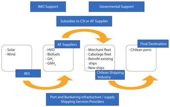 The revision of the TRL, availability, and scalability of the measures shows that a combined path needs to be established for the Chilean shipping industry to follow rather than individual initiatives, even though the latter have been most frequently followed to date. Collaboration seems to be the right path, specifically with academics serving to integrate the industry and the government. The experience gained from academia-based research needs to be transferred to the industry, and the only comprehensive way to undertake this is through involvement while developing initiatives. The three main bodies involved in this path are the shipping industry, academics, and the government, and, because of the nature of each of them, it is not an easy task. The shipping industry focuses on trade and keeping ships under continuous operation; academics focus on distributing their time between lecturing, student advising, administration duties, and R&D activities; and the government, through the ministries, is preoccupied with dealing with the needs of the whole country. When inserting these three bodies in the value chain of shipping, the energy supplier is left outside, creating a barrier to the actual implementation of any measure that could help to replace conventional fuels with AFs, thereby facilitating the mandated energy transition. In Figure 4, part of the AF supply value chain is presented, showing some of the alternatives to cope with the aforementioned barrier found when implementing AFs.