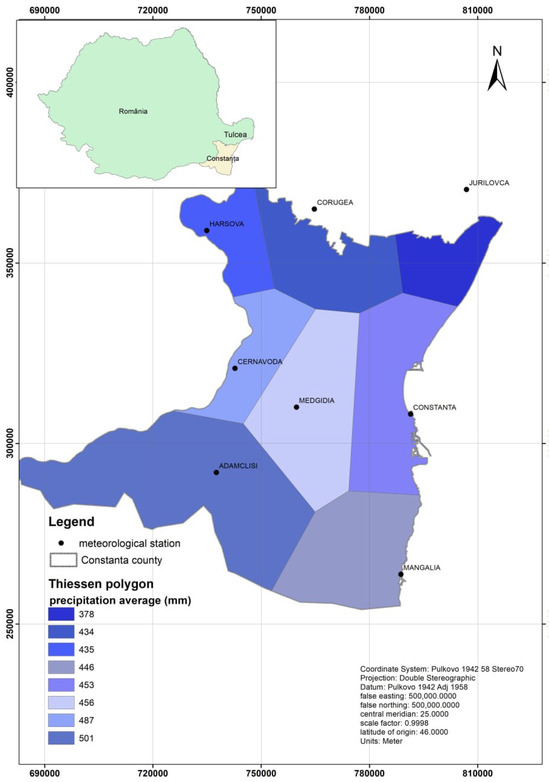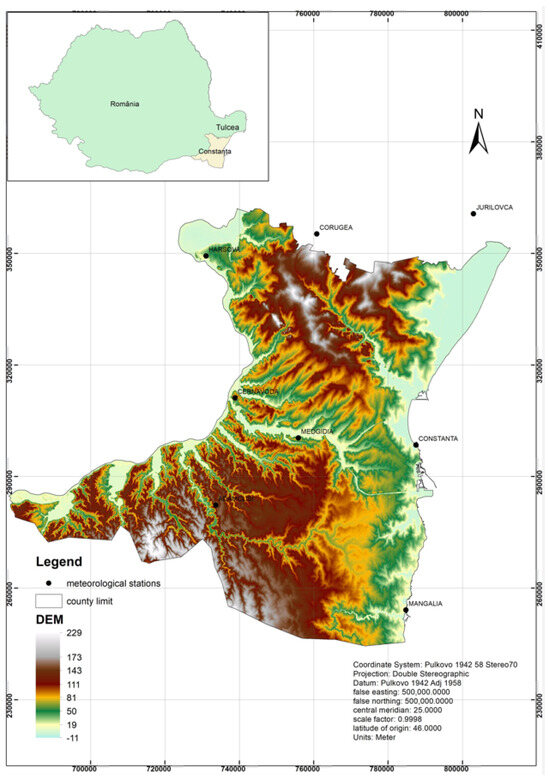The average multiannual temperature and precipitation for the investigated period are presented in Table 1. The temperature is higher on the coast (Constanța and Mangalia) than in the rest of the territory, and the precipitation varies between 435 and 500 mm [28,30].