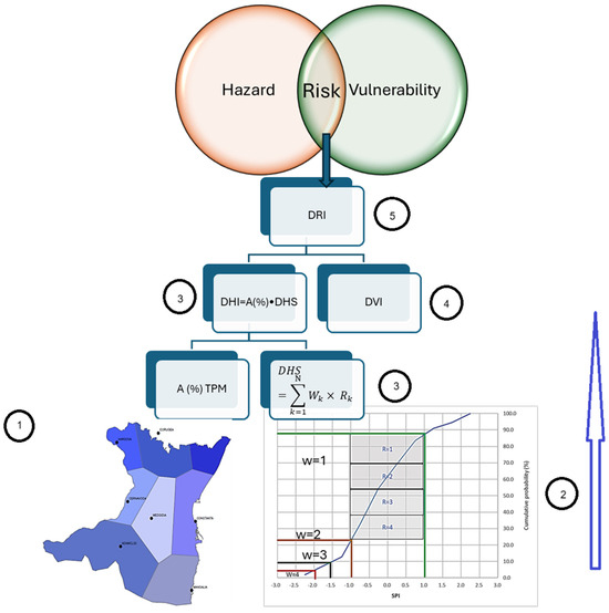 According to the Sendai definition [42], risk includes hazard and vulnerability. Based on this, the methodology proposed aims to estimate the Drought Risk Index (DRI) by evaluating the Drought Hazard Index (DHI) and Drought Vulnerability Index (DVI), in the following stages (Figure 2).